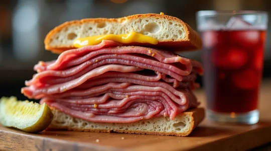 Le sandwich à la viande fumée, ou smoked meat, est un héritage direct de la communauté juive ashkénaze. Il ne s’agit pas juste de bœuf, mais d’un savoir-faire complexe : la poitrine de bœuf (brisket) est saumurée pendant des jours, fumée, puis cuite lentement à la vapeur. Pour commander comme un habitué dans un temple comme Schwartz’s, demandez un « medium-fat » : c’est l’équilibre parfait entre la viande maigre et le gras qui lui donne toute sa saveur, servi sur un pain de seigle avec de la moutarde jaune.