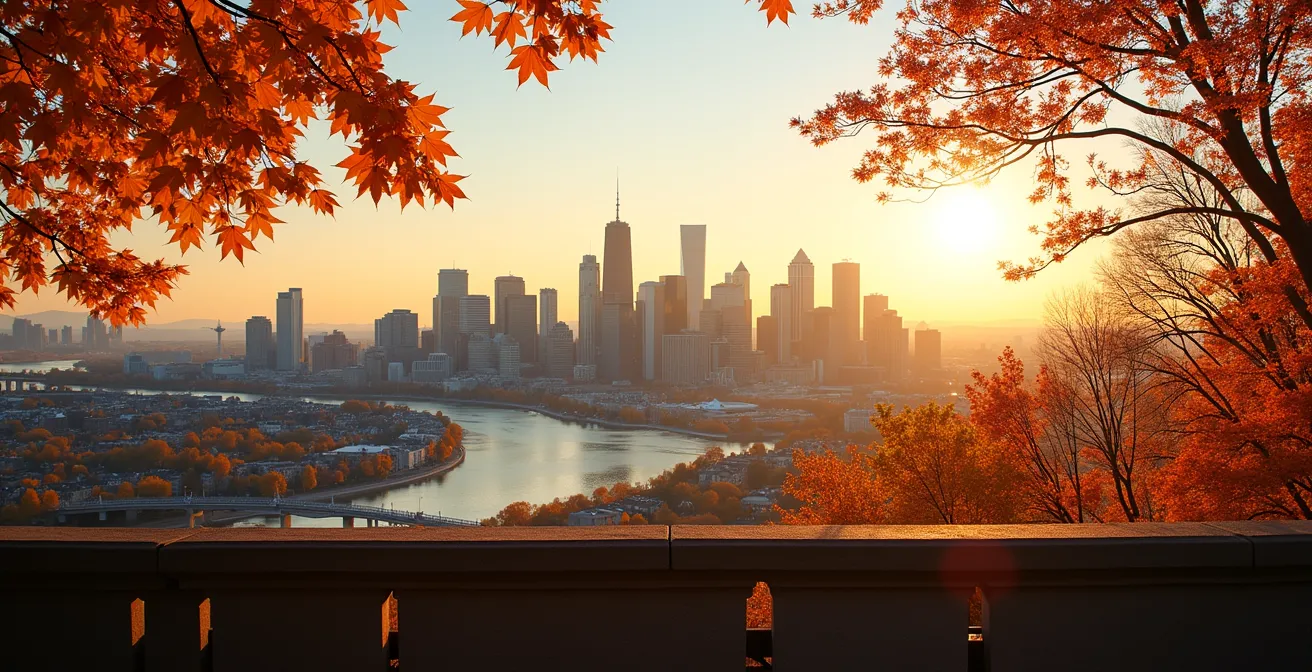 N’hésitez pas à vous décaler complètement sur les extrémités est ou ouest de la terrasse. Vous pourrez ainsi utiliser les arbres et les branches comme avant-plan naturel, surtout en automne avec les couleurs flamboyantes des érables. Ces éléments au premier plan aident à guider l’œil du spectateur vers le centre-ville et à créer une sensation d’immersion. Pensez également à varier la hauteur de votre appareil. Une prise de vue au ras du muret en pierre peut offrir une perspective surprenante et mettre en valeur sa texture.