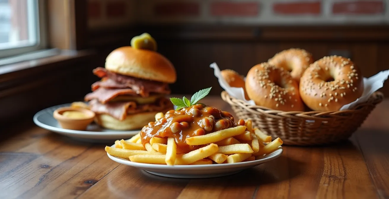 Pour le voyageur en mission gourmande à Montréal, la feuille de route semble simple : poutine, smoked meat, bagel. Une checklist, trois cases à cocher. Pourtant, cette approche, si commune soit-elle, passe à côté de l’essentiel. Car à Montréal, ces trois plats ne sont pas de simples spécialités locales ; ils forment une sorte de sainte trinité gastronomique, un héritage culturel doté de ses propres temples, de ses dogmes intangibles et de ses hérésies impardonnables. Cocher les cases est facile. S’initier au culte, voilà le véritable défi. Le risque ? Tomber dans les pièges à touristes, commettre un impair culinaire ou, pire encore, goûter une imitation sans même le savoir.